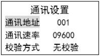 該功能設(shè)置控制裝置通訊參數(shù), 以便上位機(jī)可與其進(jìn)行數(shù)據(jù)通訊, 包含設(shè)備通訊地址(1~255)、通訊波特率(2400、4800、9600、19200)、校驗方式(奇校驗、偶校驗、無校驗) 設(shè)置。注意: 在同一個 RS485 網(wǎng)絡(luò)中設(shè)備通訊地址不能重復(fù)。用戶按“SET”鍵使相應(yīng)數(shù)值進(jìn)入修改狀態(tài), 在此狀態(tài)下, 通過