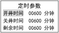 該菜單用于設(shè)置定時制度下的自動開關(guān)井時間及剩余時間, 設(shè)置范圍 1~ 32767 分鐘。
